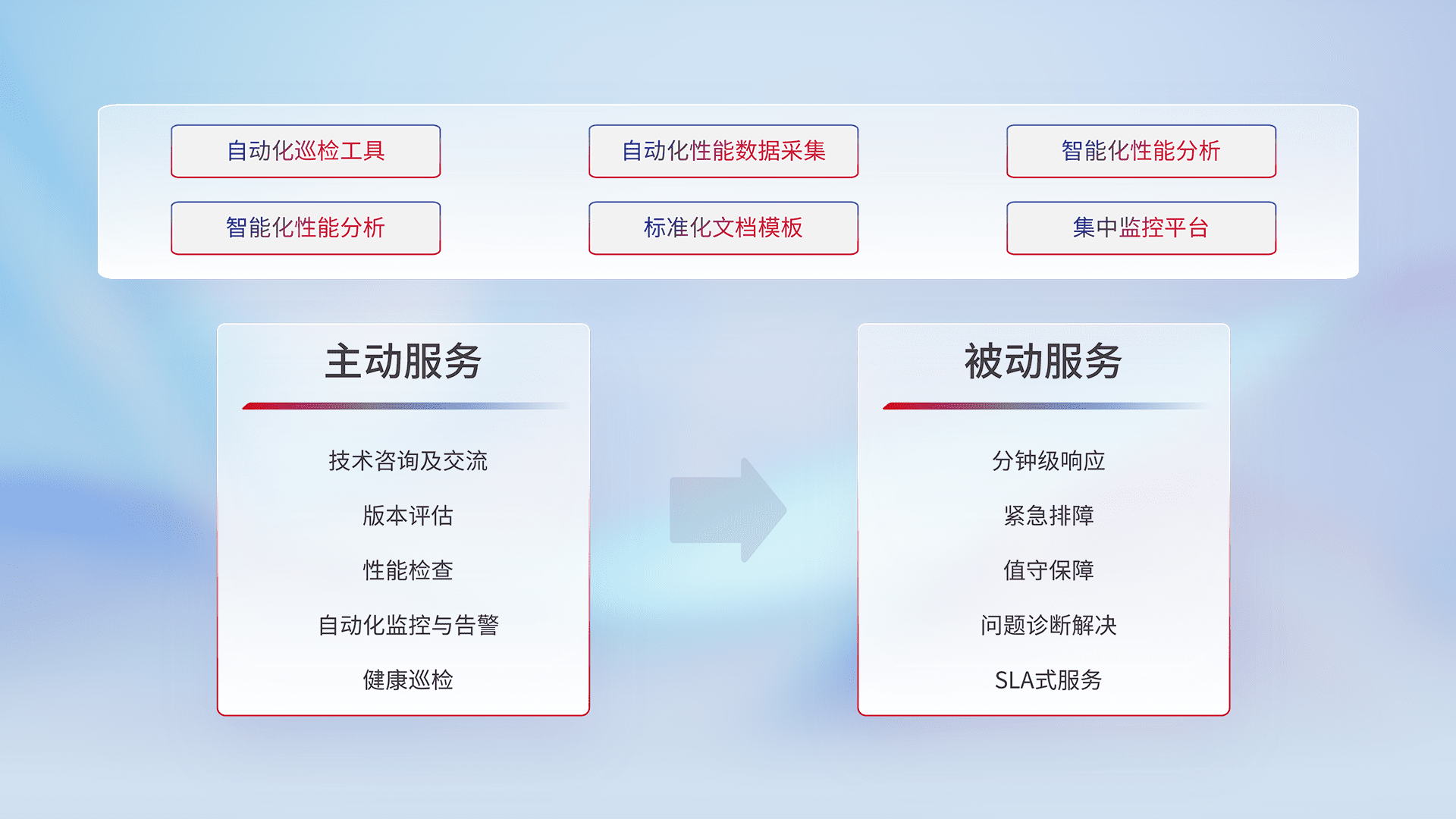 智能化工具和标准化文档,,保障服务质量,,,,提供主动服务(包含技术咨询、、版本评估、、、性能检查、、、自动化监控与告警、、、、健康巡检)和被动服务包含(分钟级响应、、紧急排障、、值守保障、、、问题诊断解决、、、SLA服务)。。。
