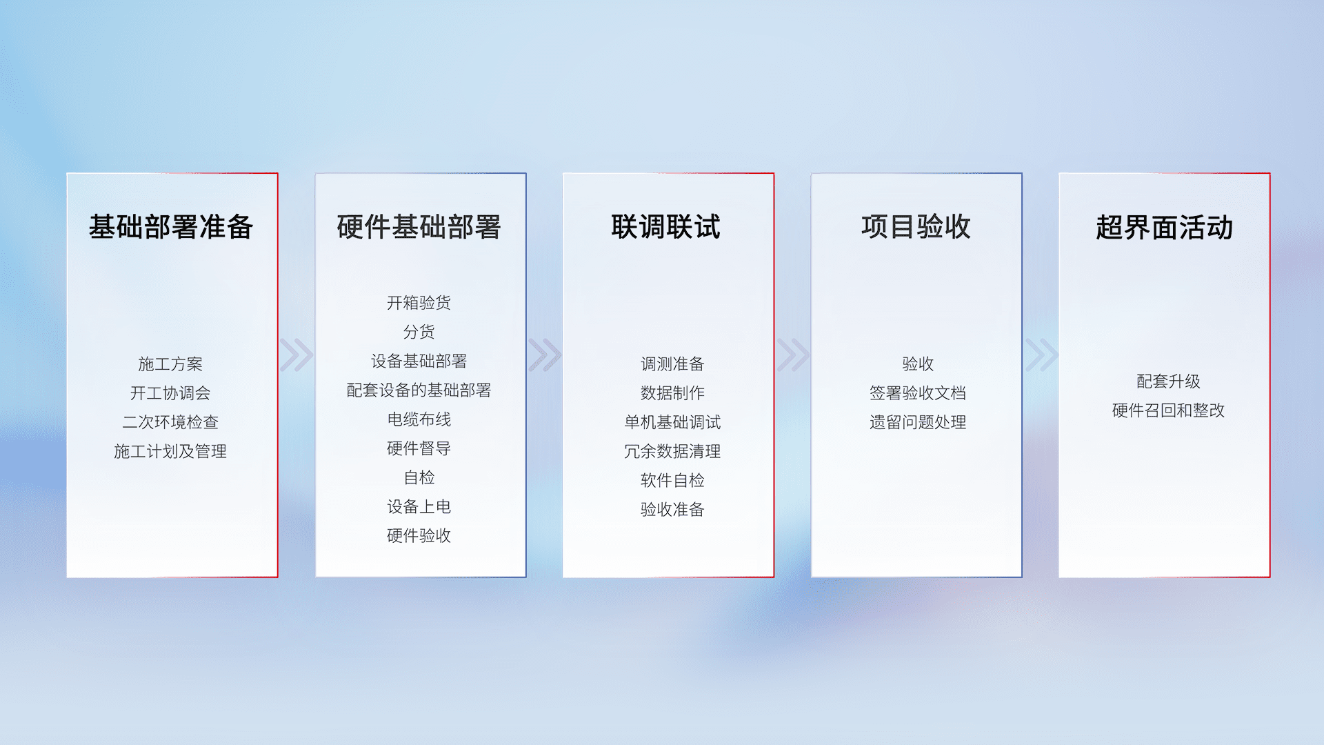 从基础部署准备、、硬件基础部署、、、、联调联试、、项目验收、、越界面活动的全过程可追溯,,保证施工质量和进度。。。。